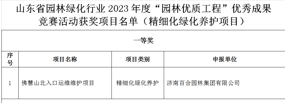 百合園林集團(tuán)參賽“園林優(yōu)質(zhì)工程”優(yōu)秀成果競賽活動(dòng)百合園林集團(tuán)喜獲精細(xì)化綠化養(yǎng)護(hù)項(xiàng)目一等獎(jiǎng)