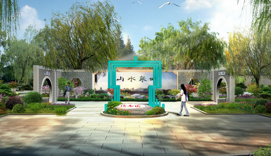 園區(qū)共設(shè)置新泉新韻、騰蛟起鳳景門、疊石清泉、清泉石澗、綠影清韻廣場、芙蕖臺、泉韻詩情景墻、荷苑清廊、泉城印象等景點,通過曲折的園路及水系連接起來。以清波榭為主的一組臨水建筑是園區(qū)的主景,形成“碧水成鏡映詩情,綠柳如絲添畫意”的詩畫意境。