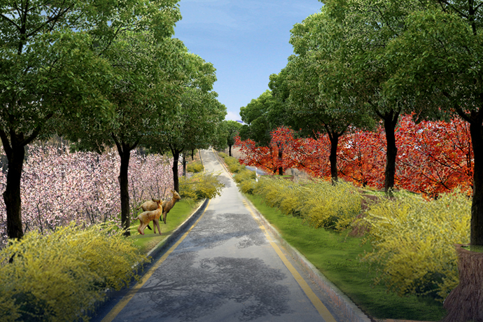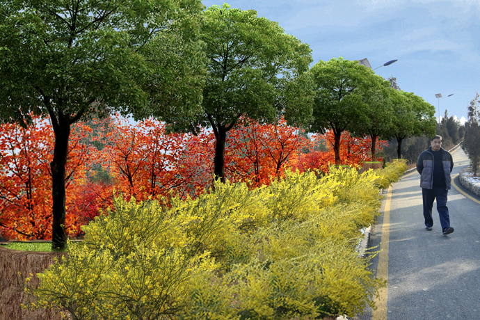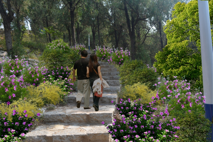 豐富植物景觀層次——公園植被以側(cè)柏、龍柏、黃櫨為主,局部地區(qū)植物長勢并不良好,致使山體巖石裸露,現(xiàn)一方面需對裸露地區(qū)進行植物補植,改善山體生態(tài)環(huán)境;另一方面對道路兩側(cè)進行植物補植,并適當增加色彩鮮明的季相花卉,完善道路兩旁植物景觀層次。