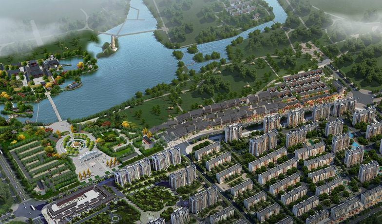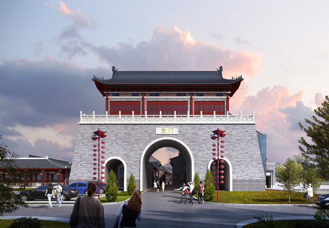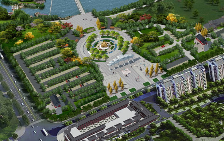 本方案范圍6.5公頃,位于臥佛寺建筑群南側(cè),普渡橋、景觀廣場、仿古商業(yè)街均以臥佛寺建筑群中大雄寶殿中軸線為參照,形成規(guī)整莊嚴的佛教主題公園布置形式。整體方案布局從佛教法器法論演化出來,法輪是古印度的一種武器演變而來,具有無堅不摧,無戰(zhàn)不勝,降伏一切的特性。