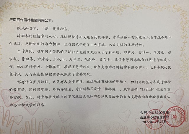 百合園林集團(tuán)積極響應(yīng)濟(jì)南文旅集團(tuán)的安排部署,迅速組織人員,全力協(xié)助社區(qū)開(kāi)展疫情防控工作,前后于11月22日,紛紛下沉到會(huì)展中心、新卉等7個(gè)社區(qū),共計(jì)50余人報(bào)名。