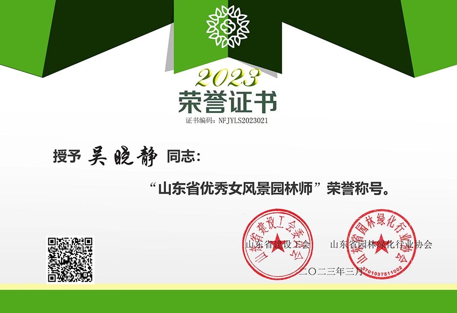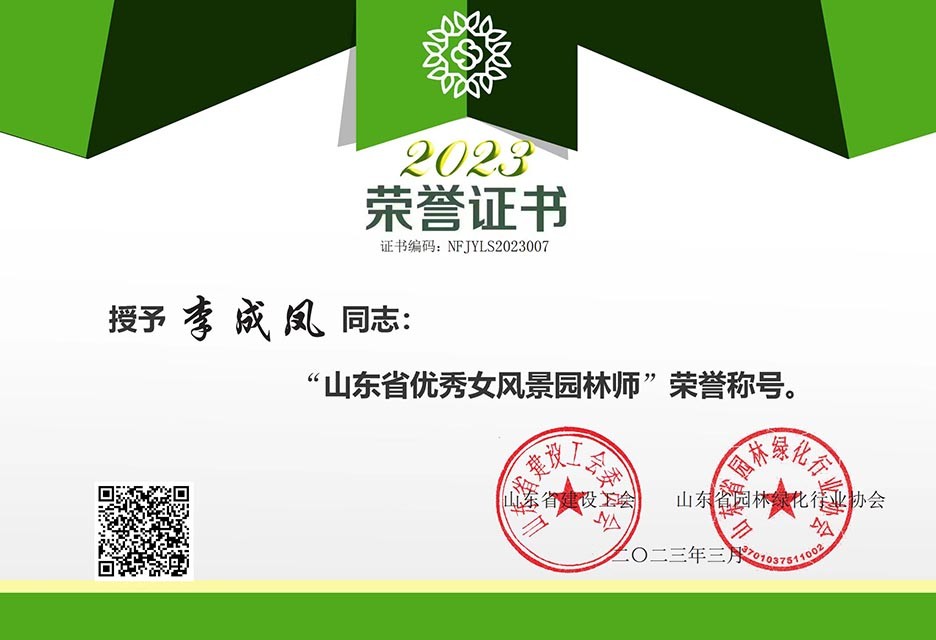 近日,由山東省建設(shè)工會和山東省園林綠化行業(yè)協(xié)會組織開展的山東省園林綠化行業(yè)第一屆“優(yōu)秀女風(fēng)景園林師”選樹結(jié)果揭曉,宣傳展示園林綠化行業(yè)女性從業(yè)者做出的突出貢獻(xiàn),百合園林集團(tuán)李成鳳、吳曉靜同志喜獲“山東省優(yōu)秀女風(fēng)景園林師”榮譽稱號。